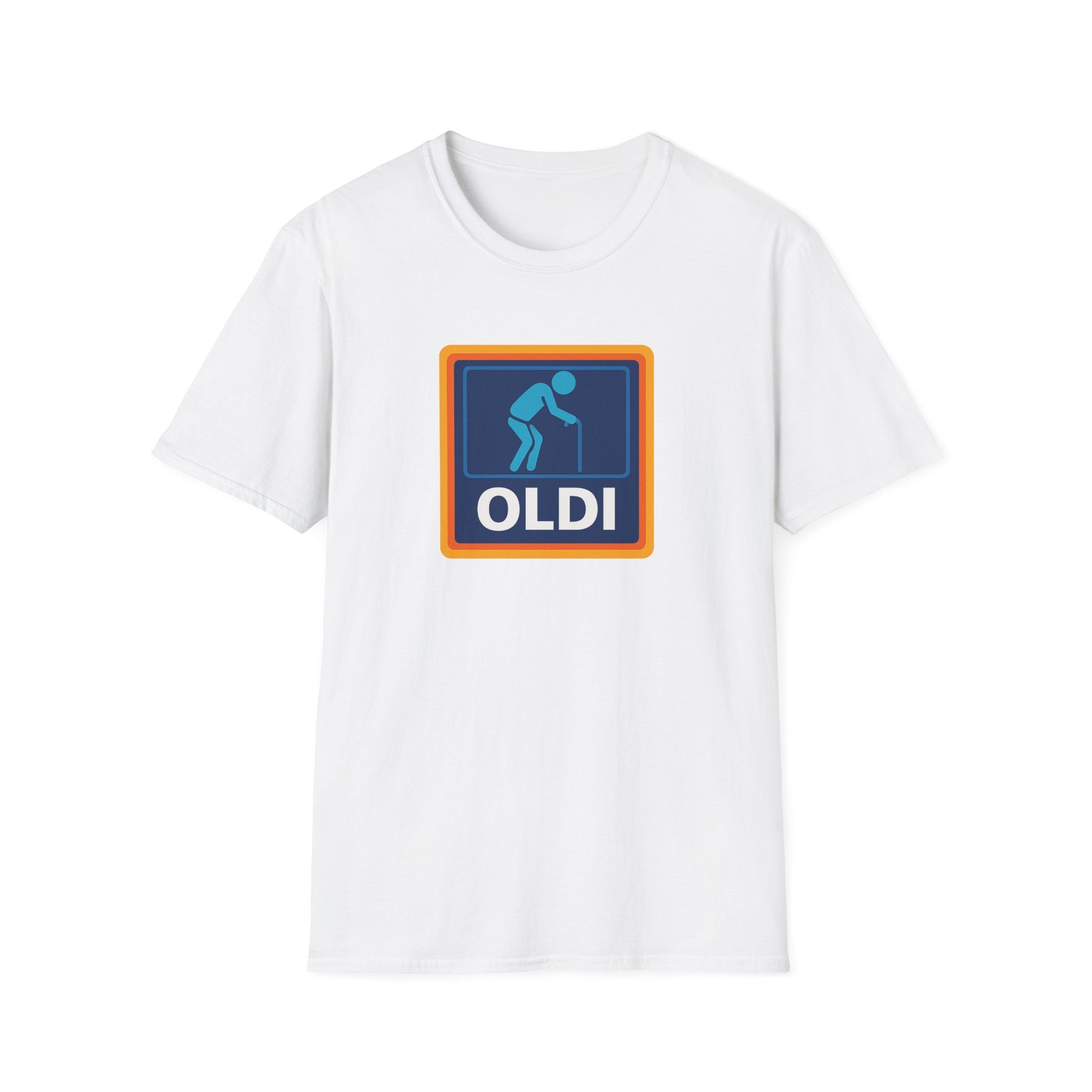 A hilarious twist on the beloved ALDI logo, this OLDI T-shirt is perfect for the golden generation who still love a good bargain—and a good laugh. Featuring a cheeky stick-figure with a cane and bold “OLDI” text, it’s a lighthearted nod to aging gracefully, with a cart full of humor.